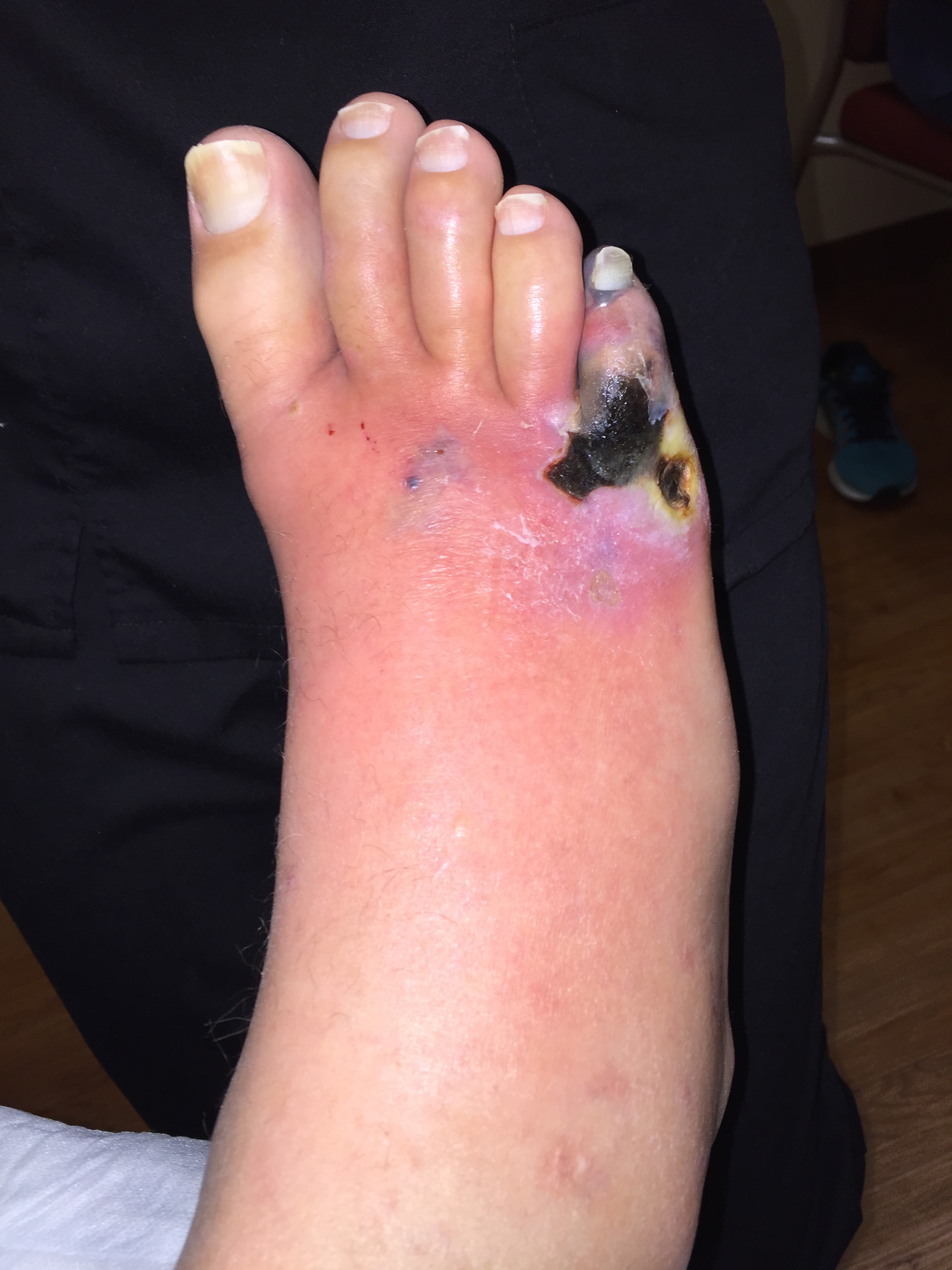 Photo 1: Note the advanced ischemia on his first visit. He has ischemic rubor of the foot.